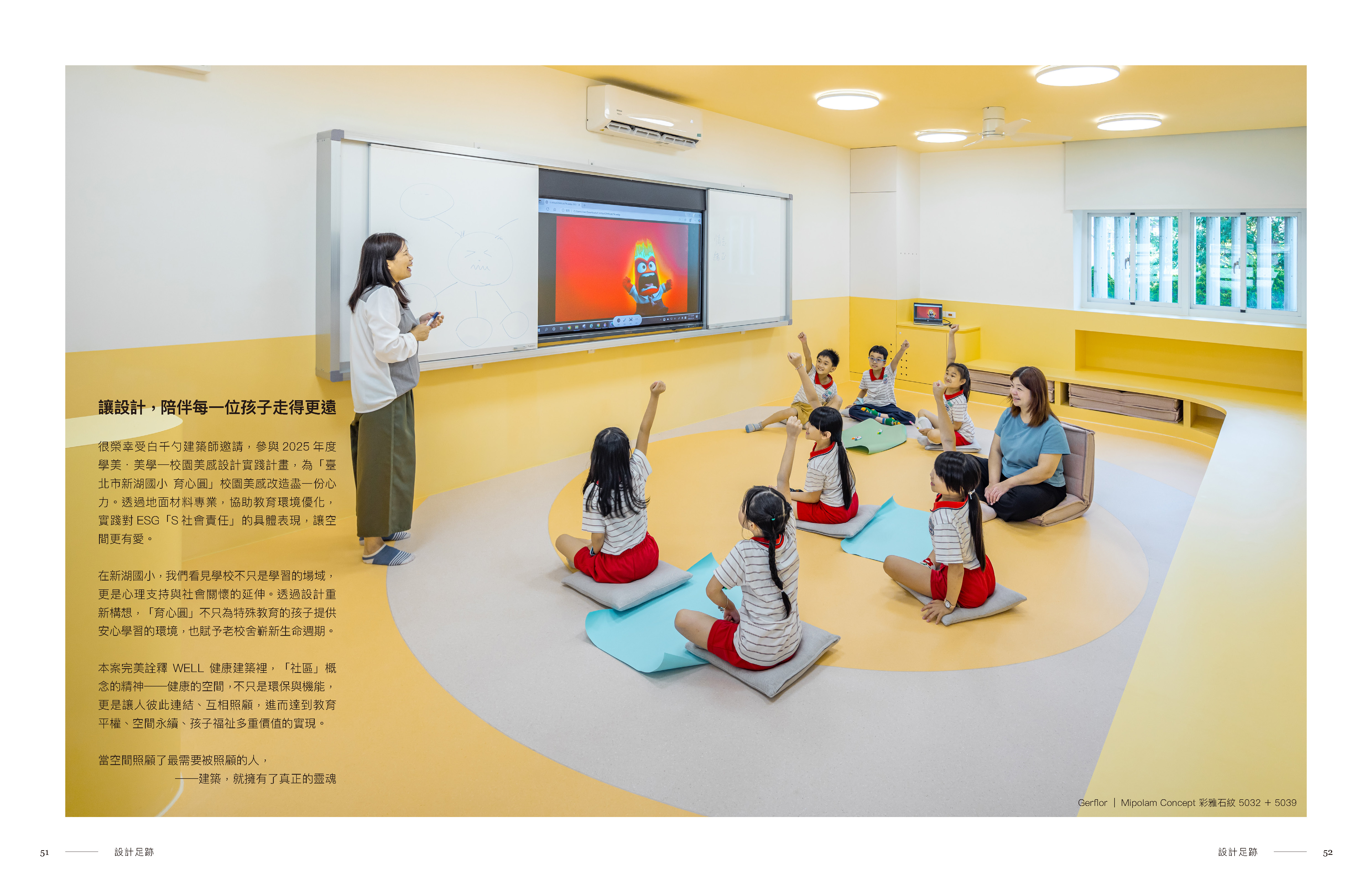 很榮幸受白千勺建築師邀請,參與2025 年度學美.美學—校園美感設計實踐計畫,為「臺北市新湖國小育心圓」校園美感改造盡一份心力。透過地面材料專業,協助教育環境優化, 實踐對ESG「S 社會責任」的具體表現,讓空間更有愛。