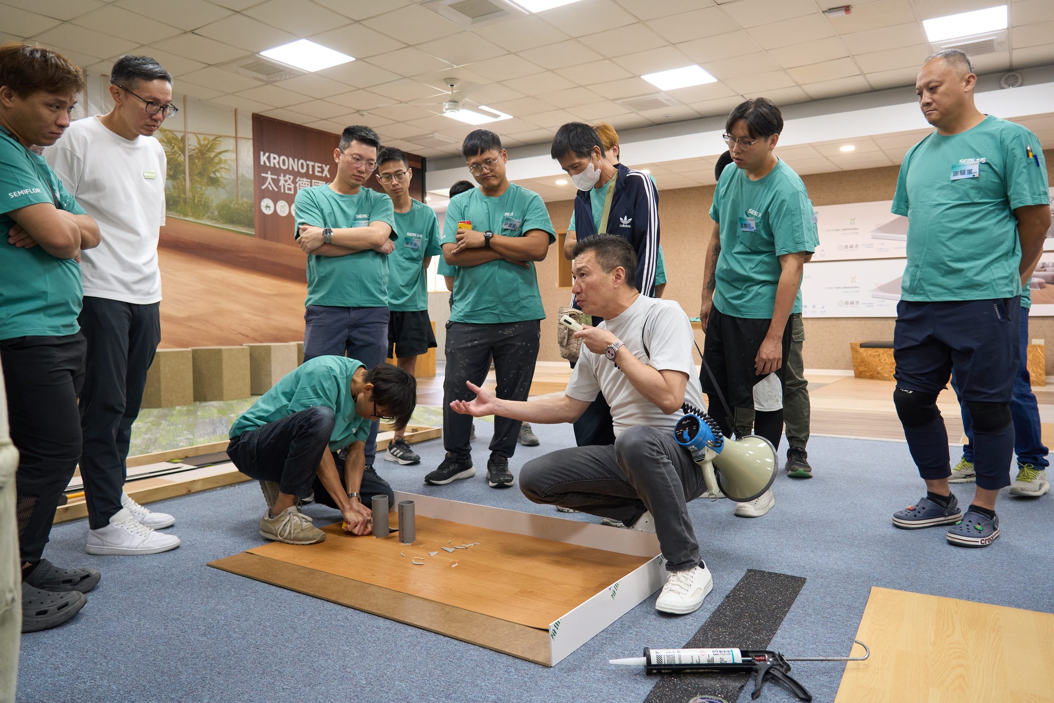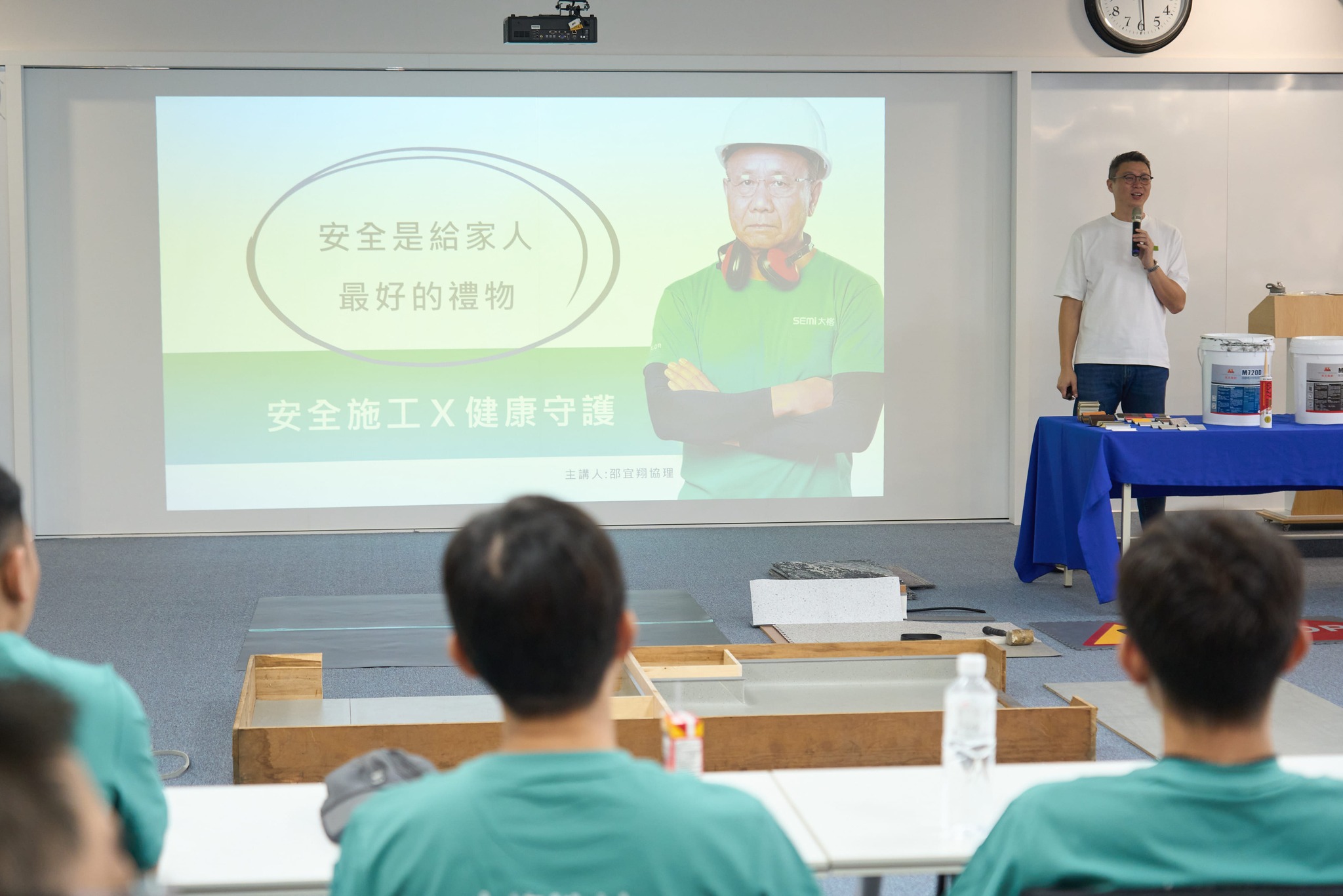 專業的厚度,來自對細節的嚴謹要求。邵宜翔協理在活動中透過長達70頁的「施工注意事項」宣導簡報,集結了第一線工地觀察與豐富經驗,從施工步驟與 NG 案例解析、工地廢棄物管理,到設備安全操作,無一不凝聚著對工藝的堅持。而在實作現場,則由工技小組 童定富資深經理與業務部 陳曉瑀經理親自帶領,引導全體師傅進行分組示範。透過「標準化工法」與「模組就位」的實作演示,大家在做中研討、在切磋中進步,共同磨練出更精湛的技藝。